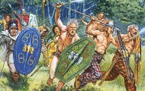W Germanii mieszkało wielu cudzoziemców, w większości Celtów i innych kultur barbarzyńskich. Germanie "kopiowali" od nich technikę walki i broń, a nawet religię. Walczyli tak samo jak Celtowie, nacierali hurmem, mało kto myślał o sposobie walki. Byli uzbrojeni w miecze, topory, włócznie i tarcze, czasem okrągłe, albo wielokątne. Chęć bogactwa omamiała wojowników, którzy walczyli dla łupów i właśnie dlatego Celtowie i Germanie byli tak okrutni przy plądrowani miasta: byli po prostu chciwi. Jednak pierwsze dyscypliny pojawiały się w sytuacjach dramatycznych. Pod Aduatucą celtycki wódz, Ambrionyks, zaatakował Rzymian stosując taktykę "podejdź i uciekaj!", znaną później przez islam jako karr wa farr. Doszło do masakry, w dramatycznym ataku legioniści ustawili się w formację orbis, w której żołnierze walczyli oparci o siebie plecami (ta taktyka była nieskuteczna, ponosiło się wtedy wielkie straty). W drugim wypadku Germanie pod wodzą Arminiusza przywrócili wolność Germanii, przejmując od Rzymian taktykę, a potem wykorzystując ją przeciwko nim. Wódź Rzymian, Publiusz Kwinktyliusz Warus, poniósł wszelką odpowiedzialność za porażkę, więc, w chwili wdarcia się Germanów do obozu, popełnił samobójstwo przebijając się mieczem (niektórzy twierdzą, że poderżnął sobie gardło).